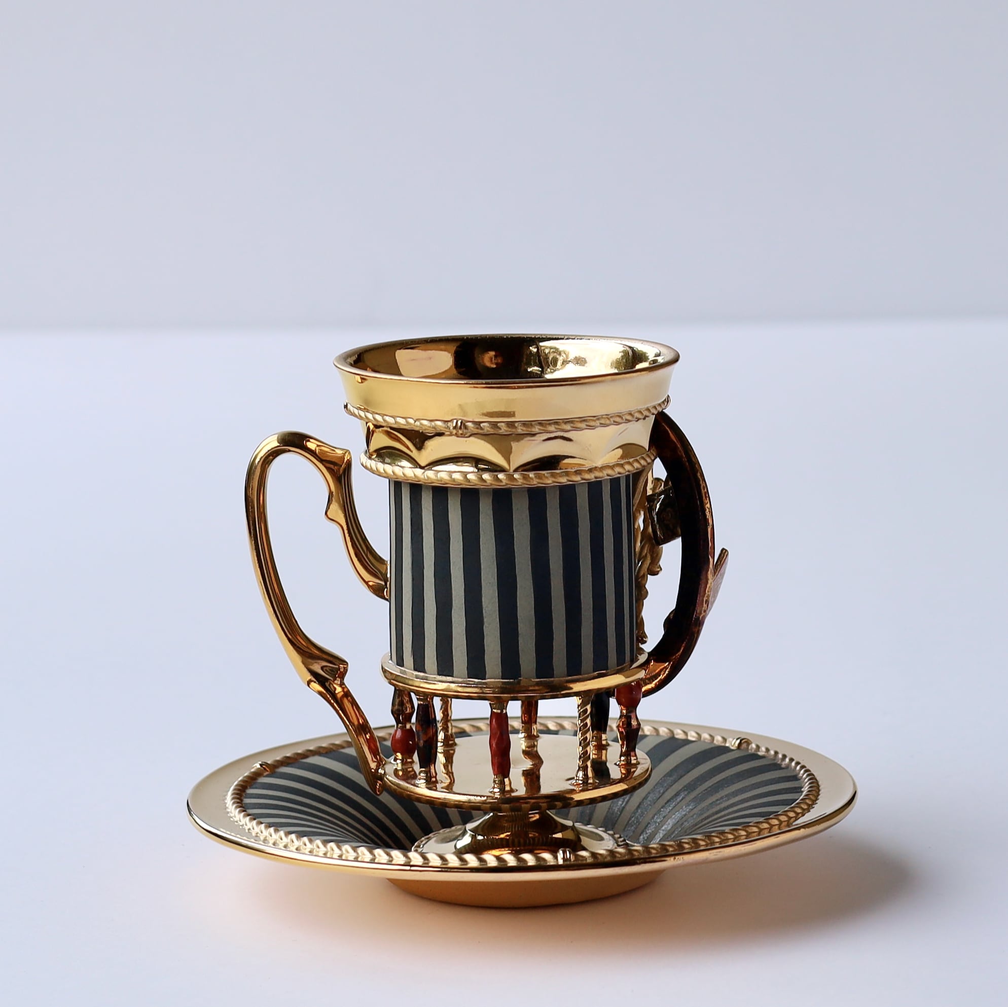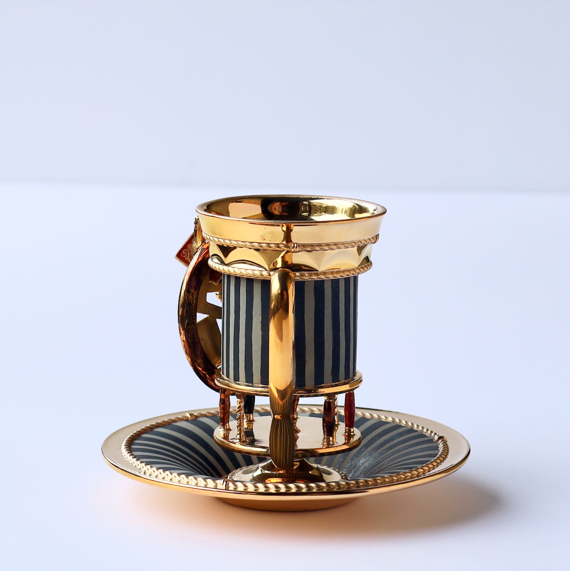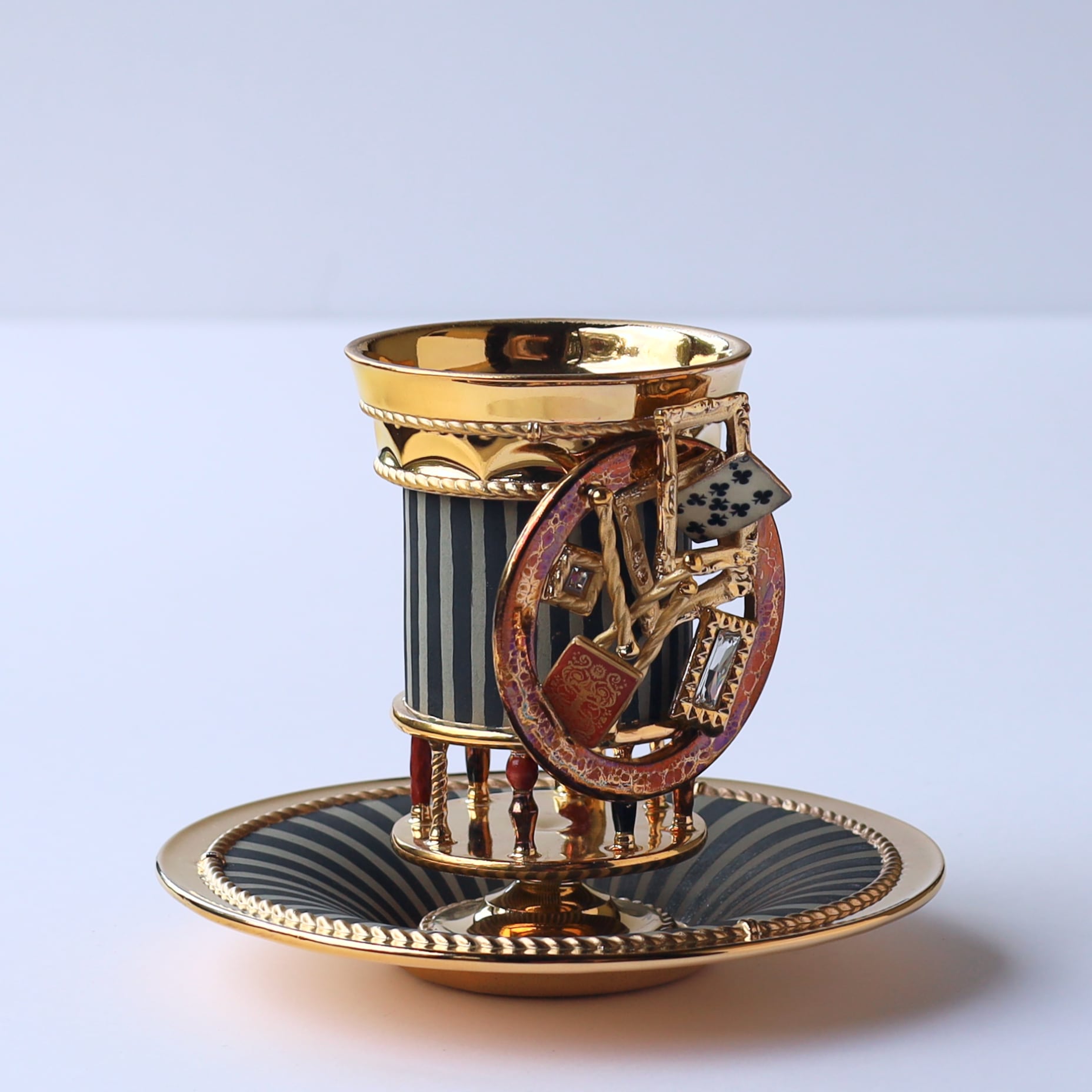 トランプが舞うトレジャーフープが際立つストライプのデコラティブピラーカップ&ソーサー